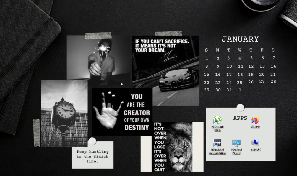 I made something new for You! Check out this desktop wallpaper,what is designed to uplift and motivate. With black and white images of inspirational scenes and quotes, it will help to keep you focused and energized throughout the day. Additionally, the desktop includes a calendar that helps to give structure to your goals and tasks, helping to ensure that you stay on track and make the most of your time. With this wallpaper, you can stay motivated and productive, knowing that you can make the most of every moment! It is 2 pages.